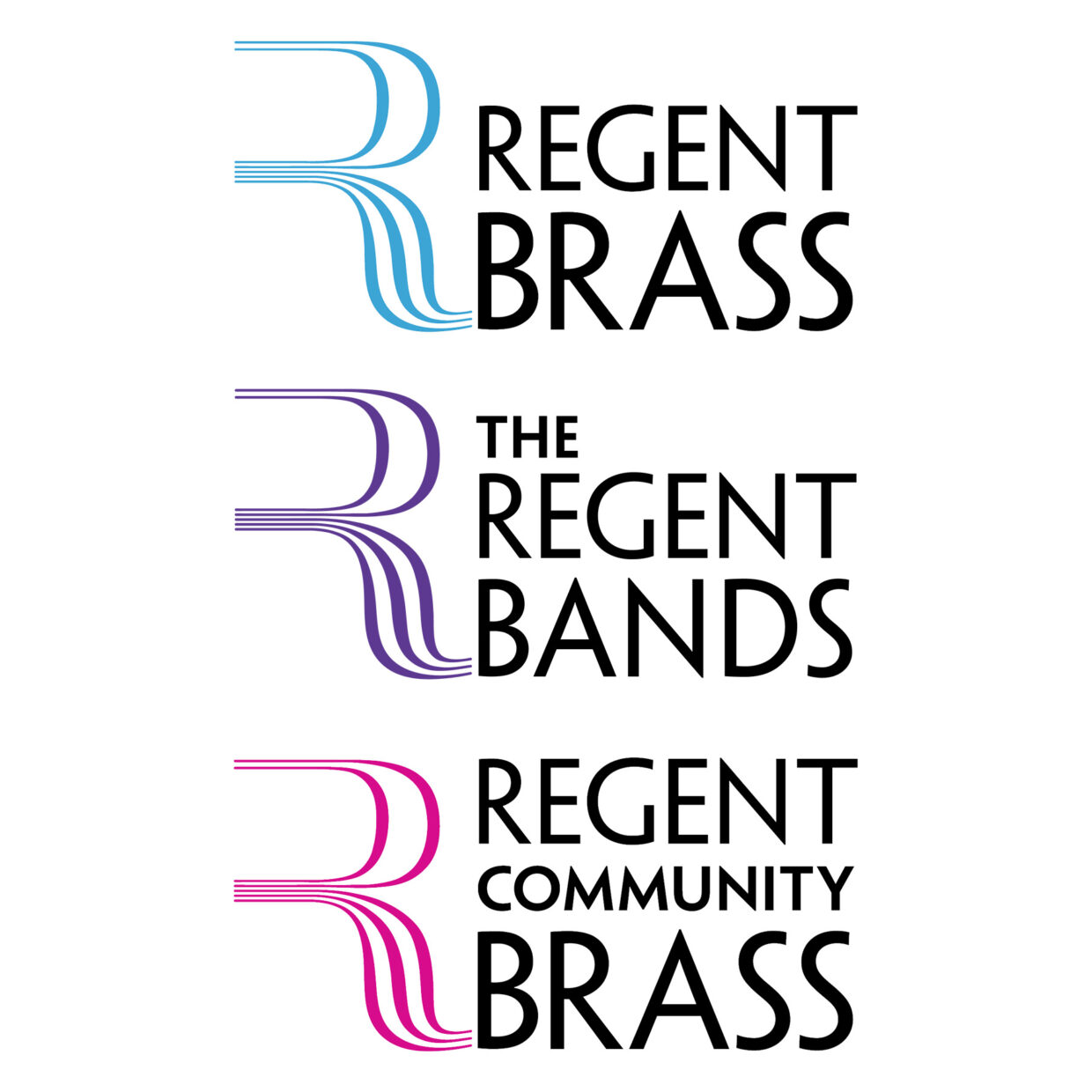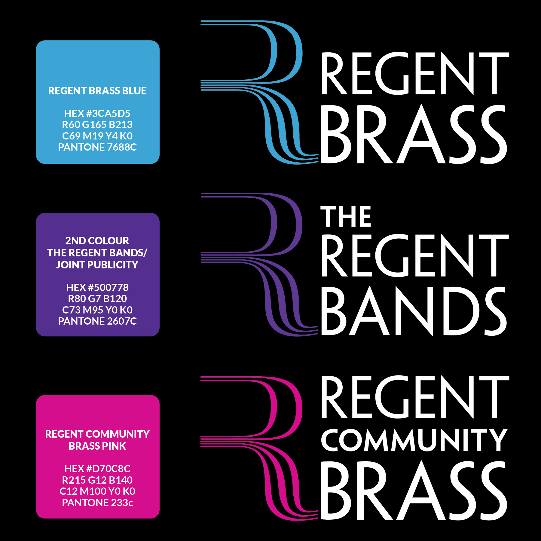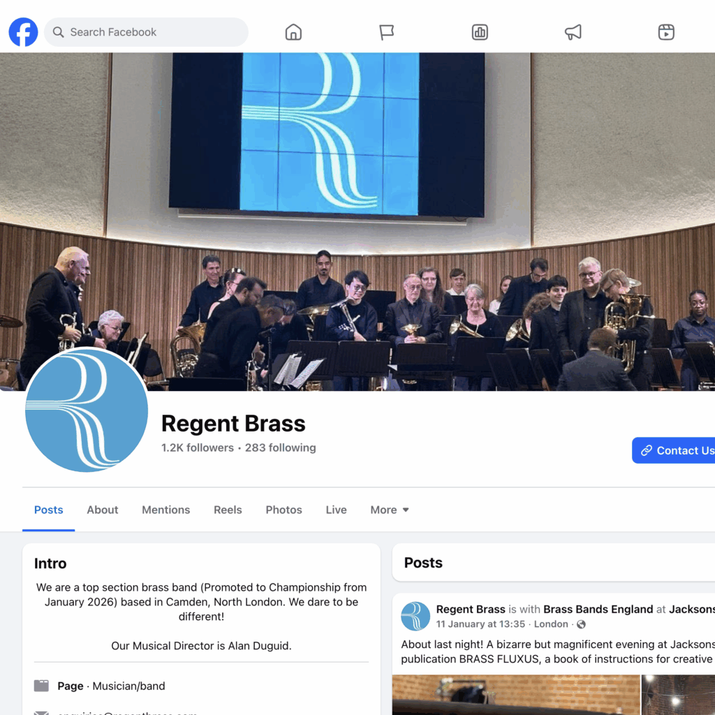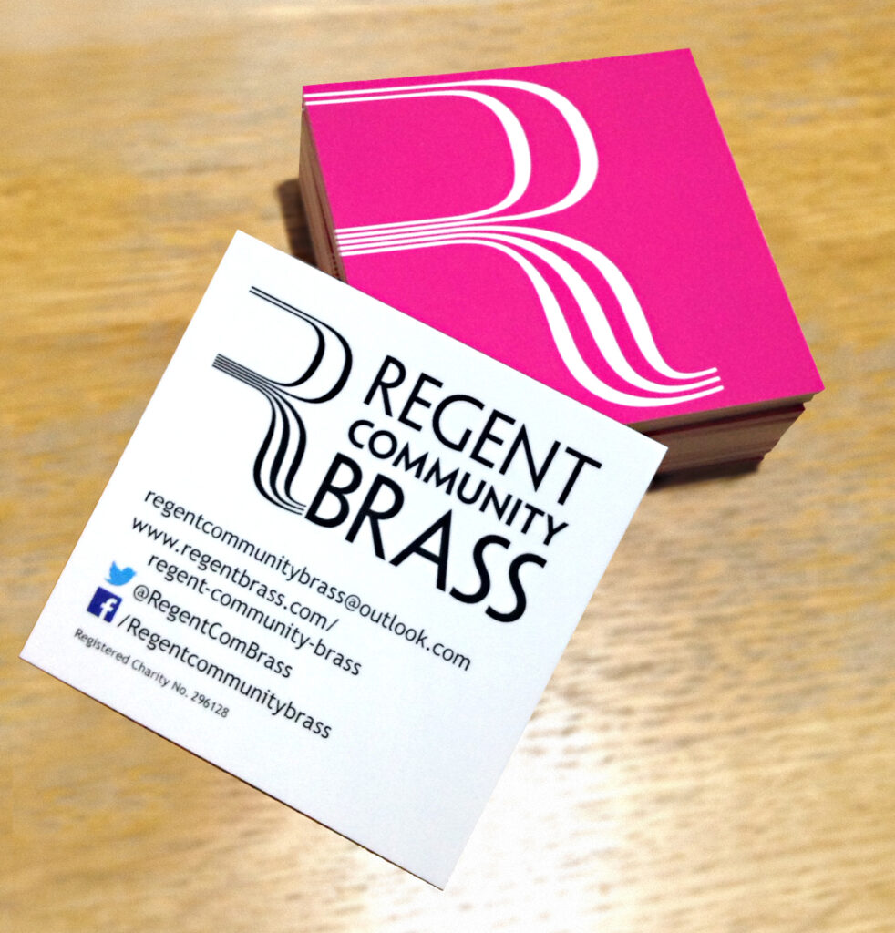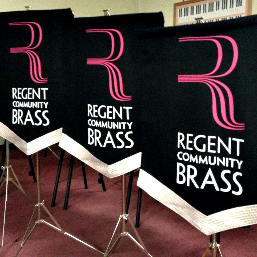 Founded in 1985 in the London Borough of Brent, Regent Brass is a leading brass band recognised for its innovative performances and championing new work for brass bands. In 2012, a second band Regent Community Brass was created to strengthen community ties and broaden access to brass music. Both bands share resources, often perform together and marked their 40th anniversary last year. I designed their dual logos and umbrella brand, The Regent Bands, using a purple blend of each band’s colours, which appears across all visual materials. I have been performing with the bands for nearly 30 years.