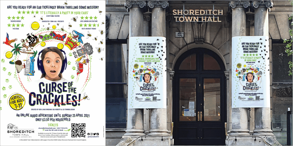 Curse of The Crackles! An ear tickling brain thrilling sonic mission for Shoreditch Town Hall. Original illustrations and design for print, web and social media.